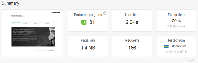 Wix ha necesitado 2.04 segundos para cargar, lo cual es un tiempo menor que WordPress, pero su tamaño de página y las peticiones que ha necesitado para cargar una página «demo» lo sitúan en la segunda posición por rendimiento.